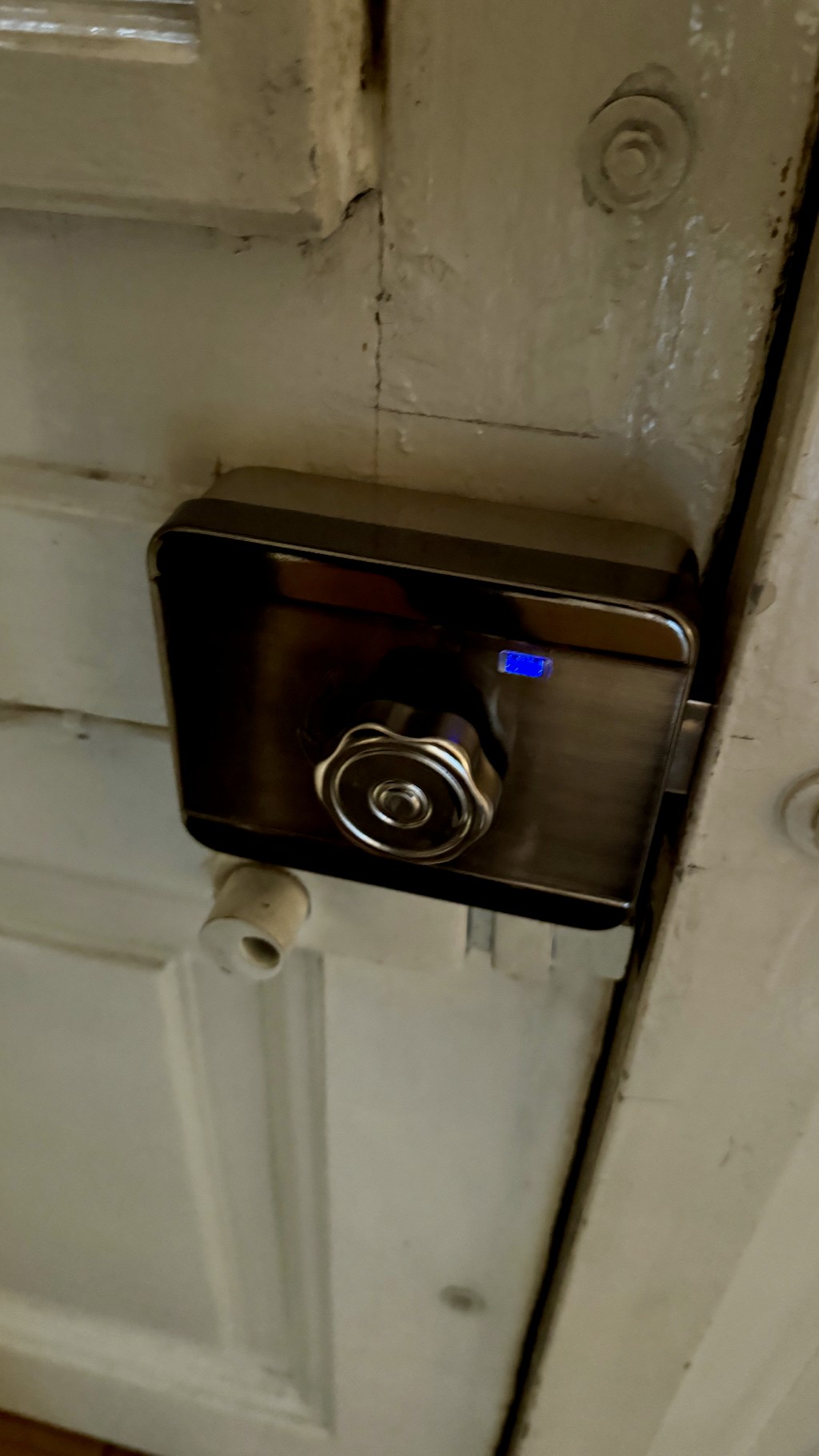 Kilincs alatt van a bluetoothos zár, egyszerűen kézzel balra fordítva kinyitod, majd ki tudod nyitni kilinccsel az ajtót, klienst beengeded, ajtót visszacsukod és a zár magától visszazár.